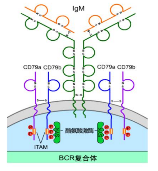 BCR受體是表達(dá)于B細(xì)胞表面的免疫球蛋白,即膜型免疫球蛋白(membrane immunoglobulin,mIg)。B細(xì)胞通過(guò)BCR識(shí)別抗原,接受抗原刺激,啟動(dòng)體液免疫應(yīng)答。